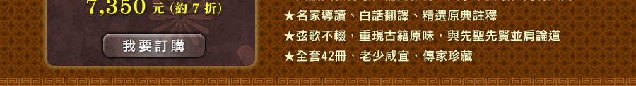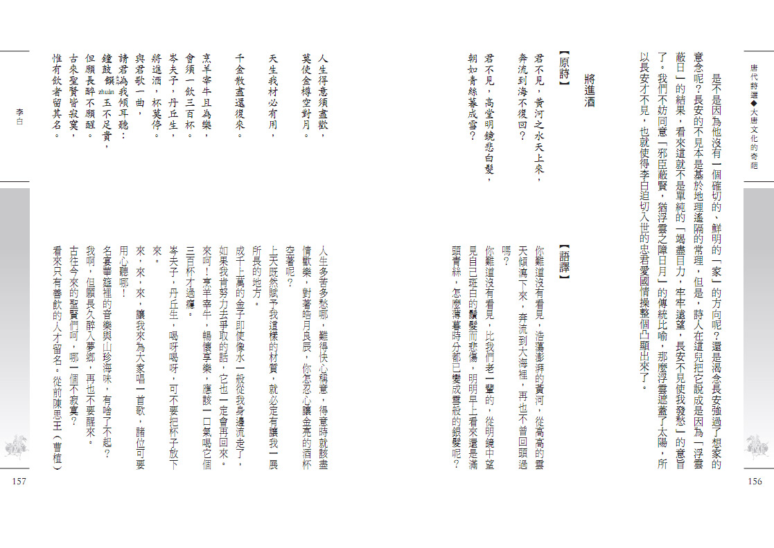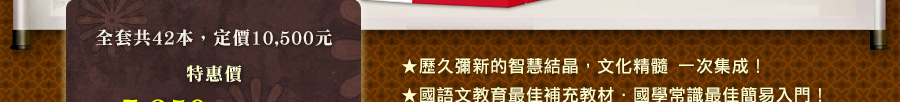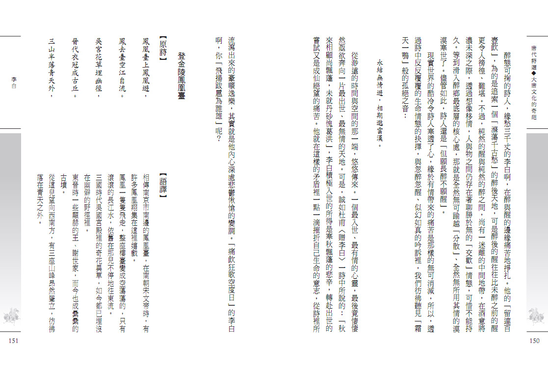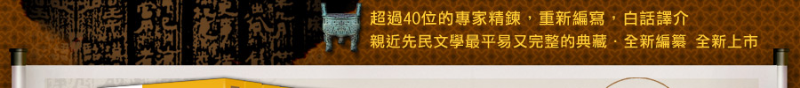 ◎國語注音加入漢語拼音,經典寶庫躍上國際舞台 在體例上也力求統整,尤其針對詩詞類做全新的整編。古詩詞裡有許多古代用語,需用現代語言翻譯,我們特別將原詩詞和語譯排列成上下欄,便於迅速掌握全詩的意旨;並在生難字詞旁邊加上國語注音,讓讀者在朗讀中體會古詩詞之美。目前全世界風行華語學習,為了讓經典寶庫躍上國際舞台,我們更在國語注音下面加入漢語拼音,希望有華語處,就有經典寶庫的蹤影。